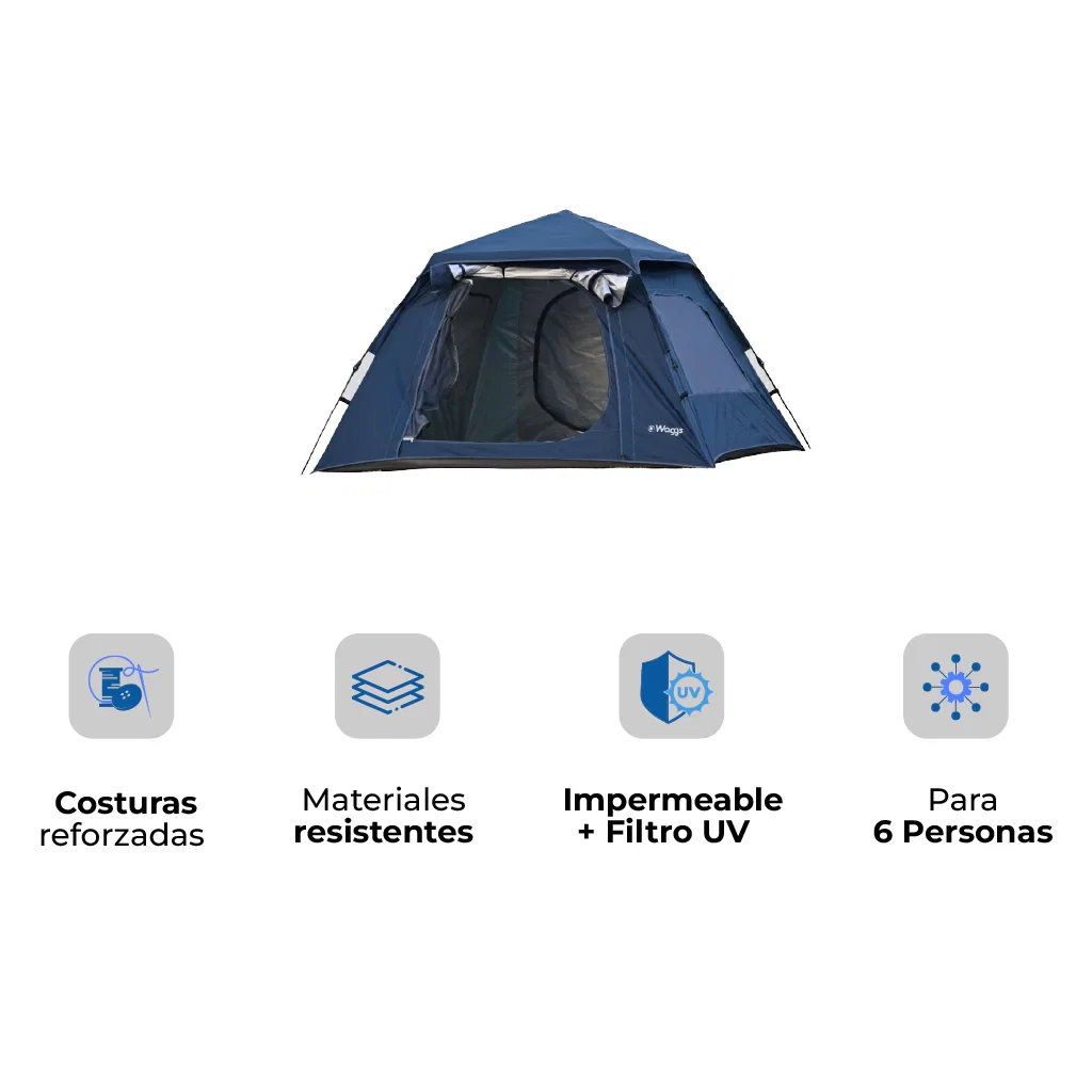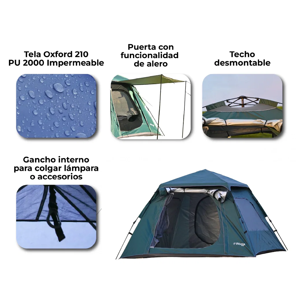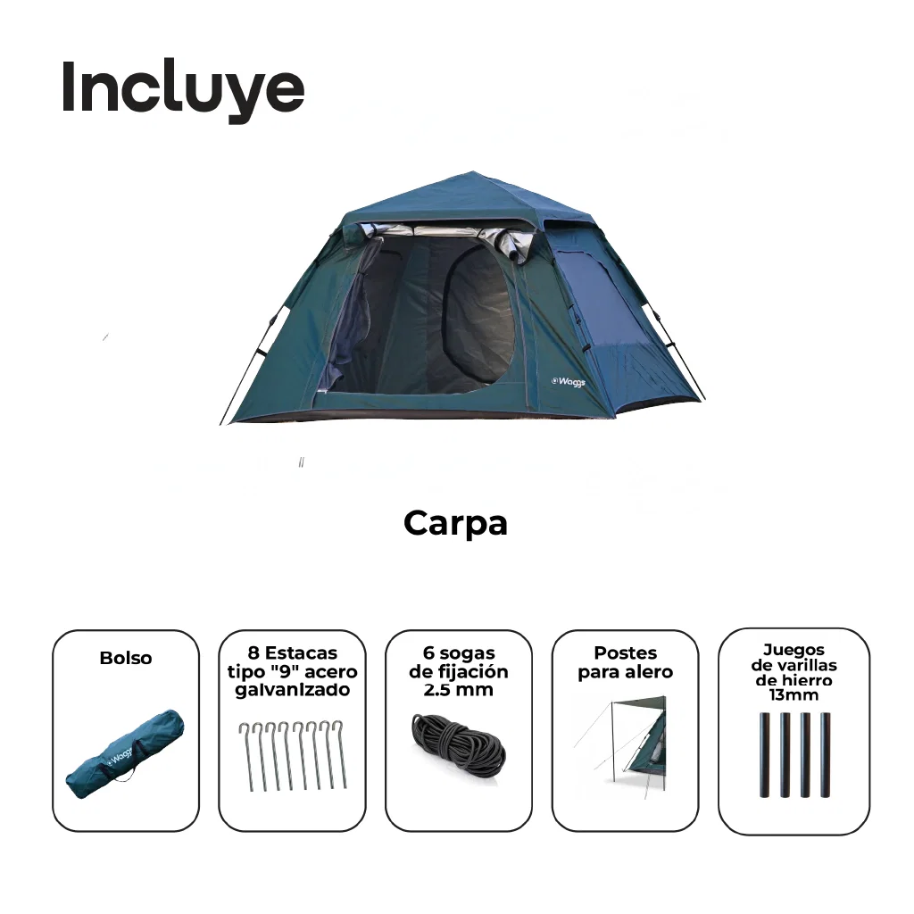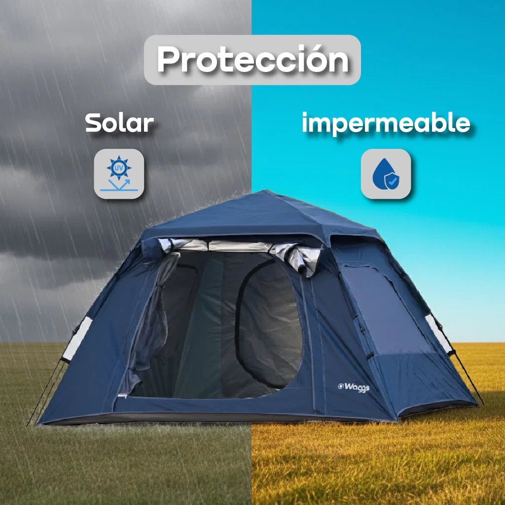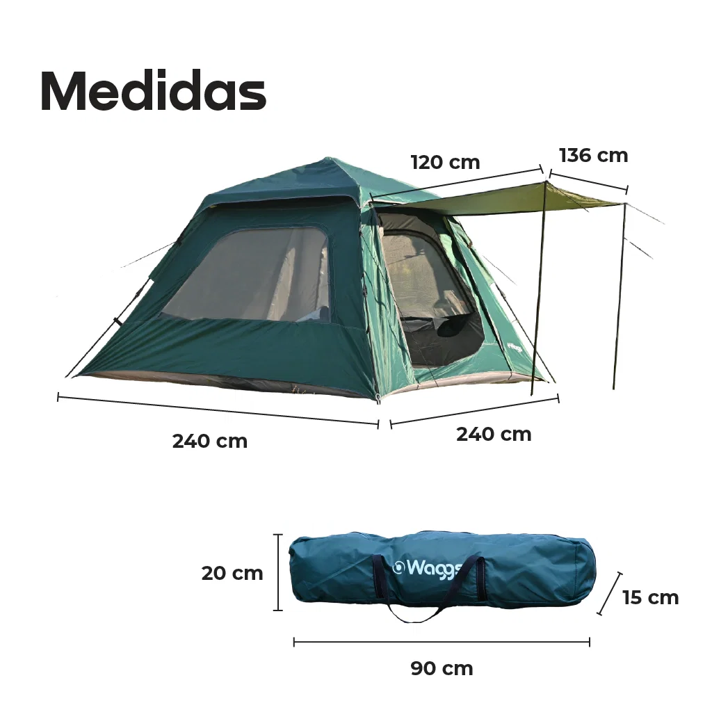 La WAGGS CARP07 está pensada para quienes buscan una carpa autoarmable amplia, práctica y resistente para disfrutar escapadas en familia o con amigos. Su sistema HUB permite un armado rápido y estable, mientras que el alero frontal integrado crea un espacio extra para cocinar, organizar equipos o simplemente relajarse a la sombra.