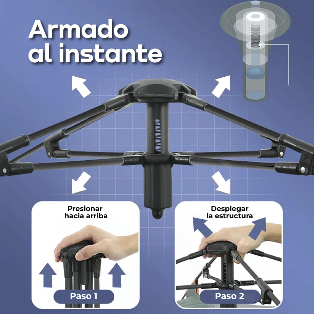 Fabricada en tela Oxford 210 con recubrimiento PU 2000 y filtro UV, brinda una protección real ante lluvia y sol, ideal para acampar en sierras, lagos, bosque o playa. Cuenta con dos accesos completos con mosquitero Mesh B3, dos ventanas laterales con cierre interno, generando ventilación cruzada gracias a los cuatro ingresos. Esto garantiza circulación constante de aire y mantiene la carpa fresca incluso en días de calor.