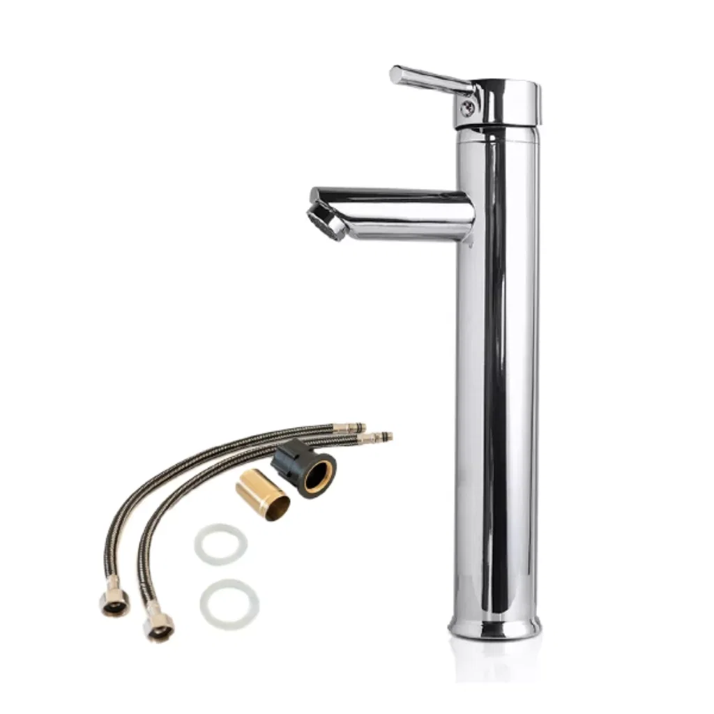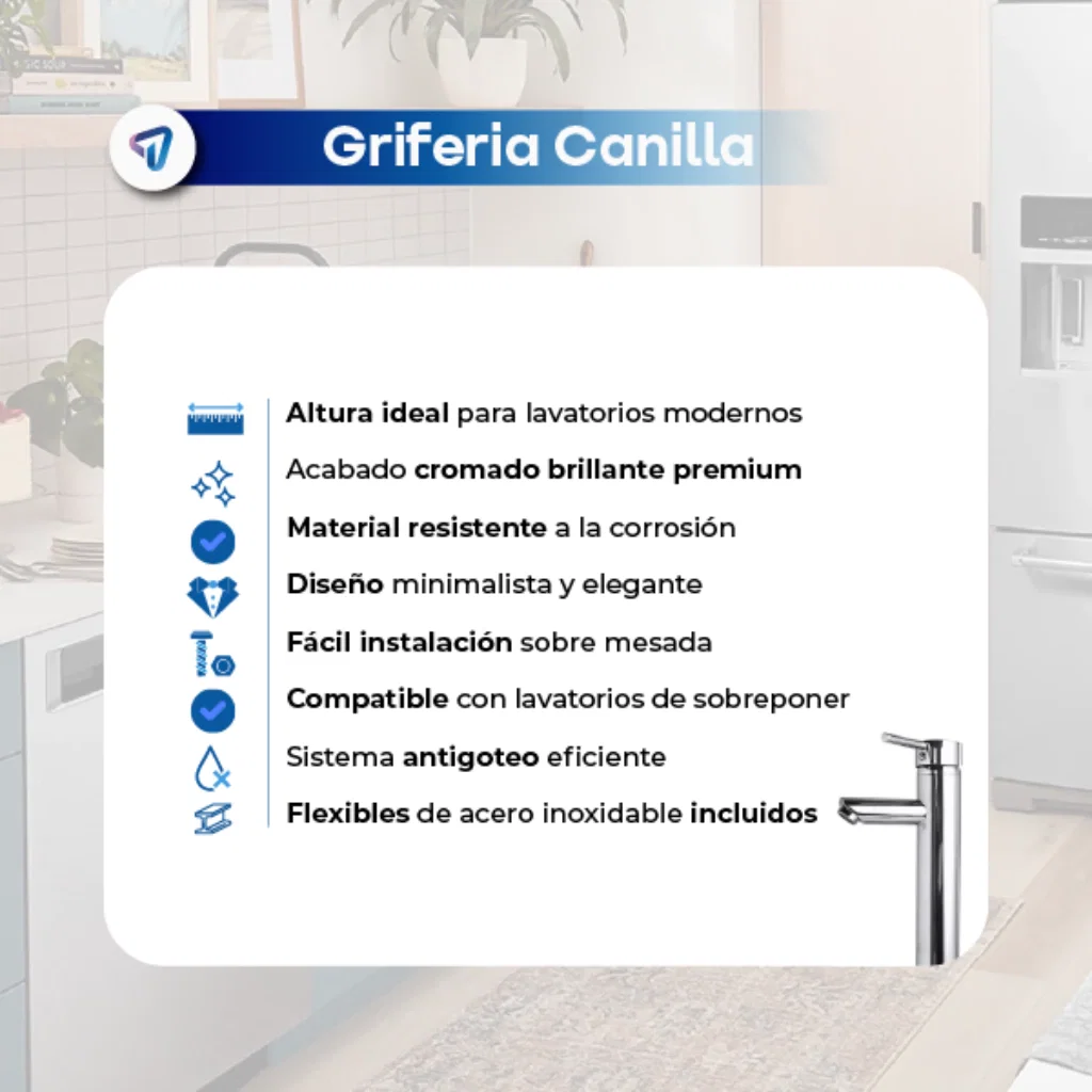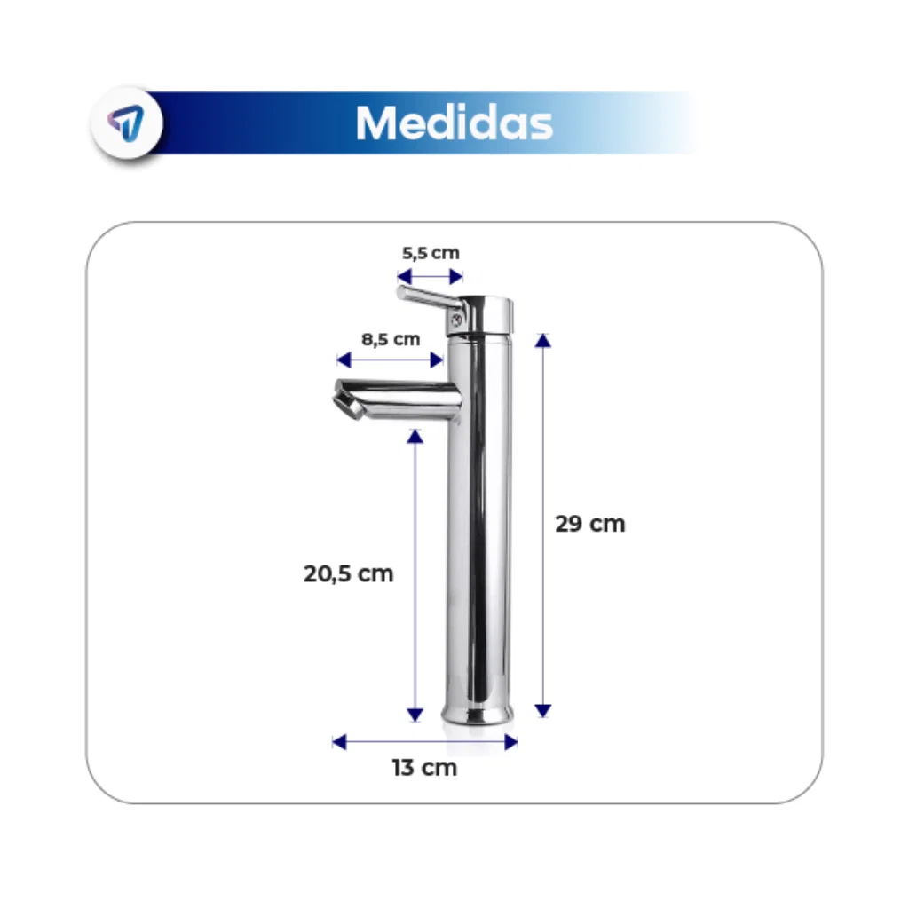 Gracias a su pico corto y estructura elevada, es ideal para lavatorios de sobreponer, combinando estilo y funcionalidad.