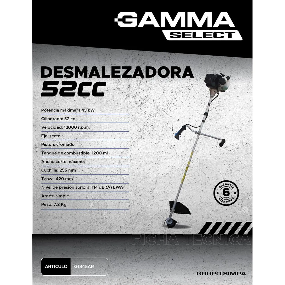 La desmalezadora Gamma Select de 52cc es la herramienta ideal para quienes buscan potencia, rendimiento y durabilidad en el mantenimiento de jardines, parques o terrenos grandes. Equipada con un motor de 2 tiempos de 1,45Kw y una velocidad de hasta 12000 rpm, esta máquina ofrece un corte eficiente incluso en maleza densa y resistente.