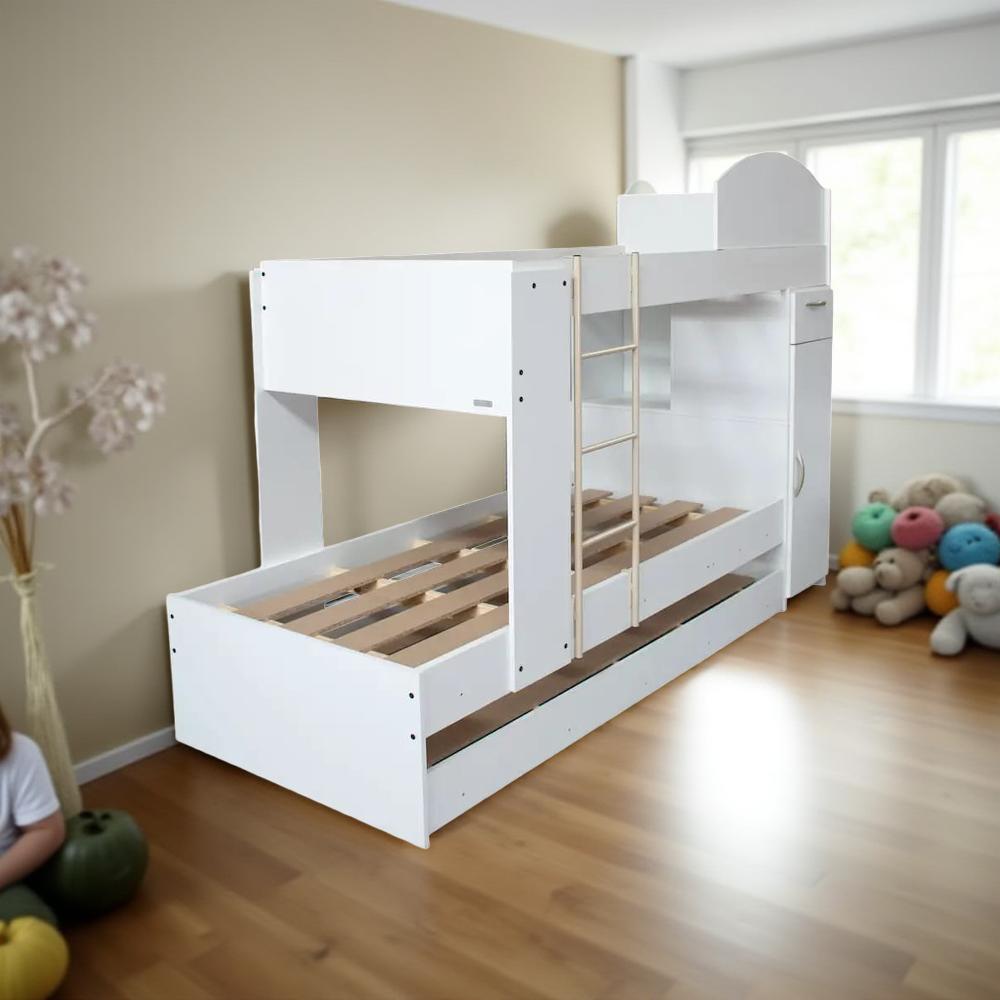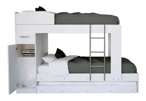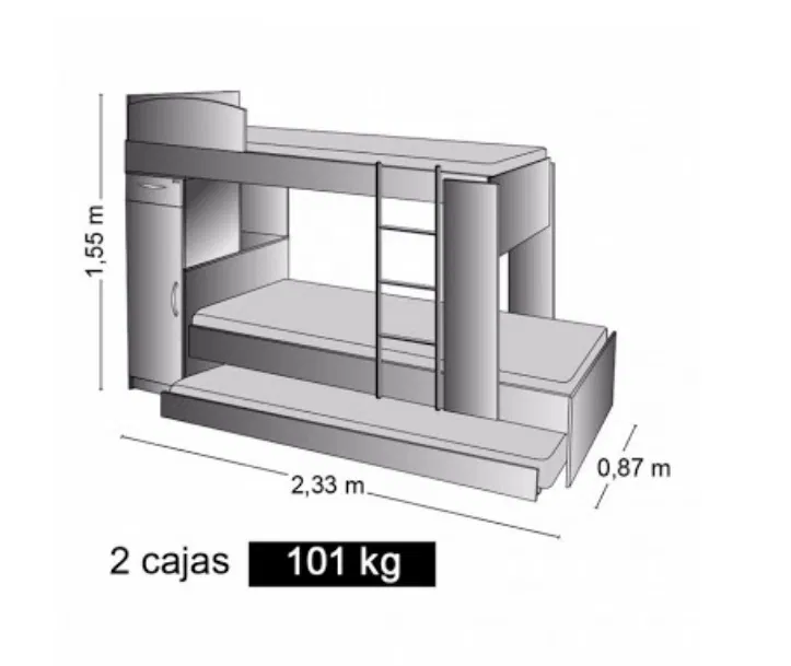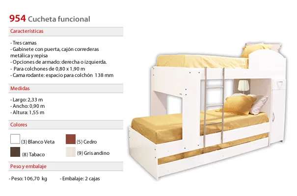 Posee 3 camas, gabinete con puerta, cajón con correderas metálicas y repisa. El gabinete puede armarse a la izq. o der. Para colchones de 0,80 x 1,90 m