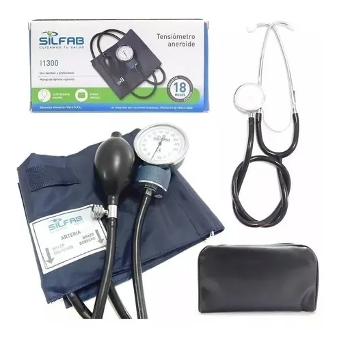 Tensiómetro aneroide Standard. Con estetoscopio biaural y manga de 22 a 32 cm de diámetro. Incluye funda vinílica. Garantía 18 meses. Las fotografías y gráficas son meramente ilustrativas. Los productos podrán sufrir modificaciones en sus accesorios y/o colores sin previo aviso.