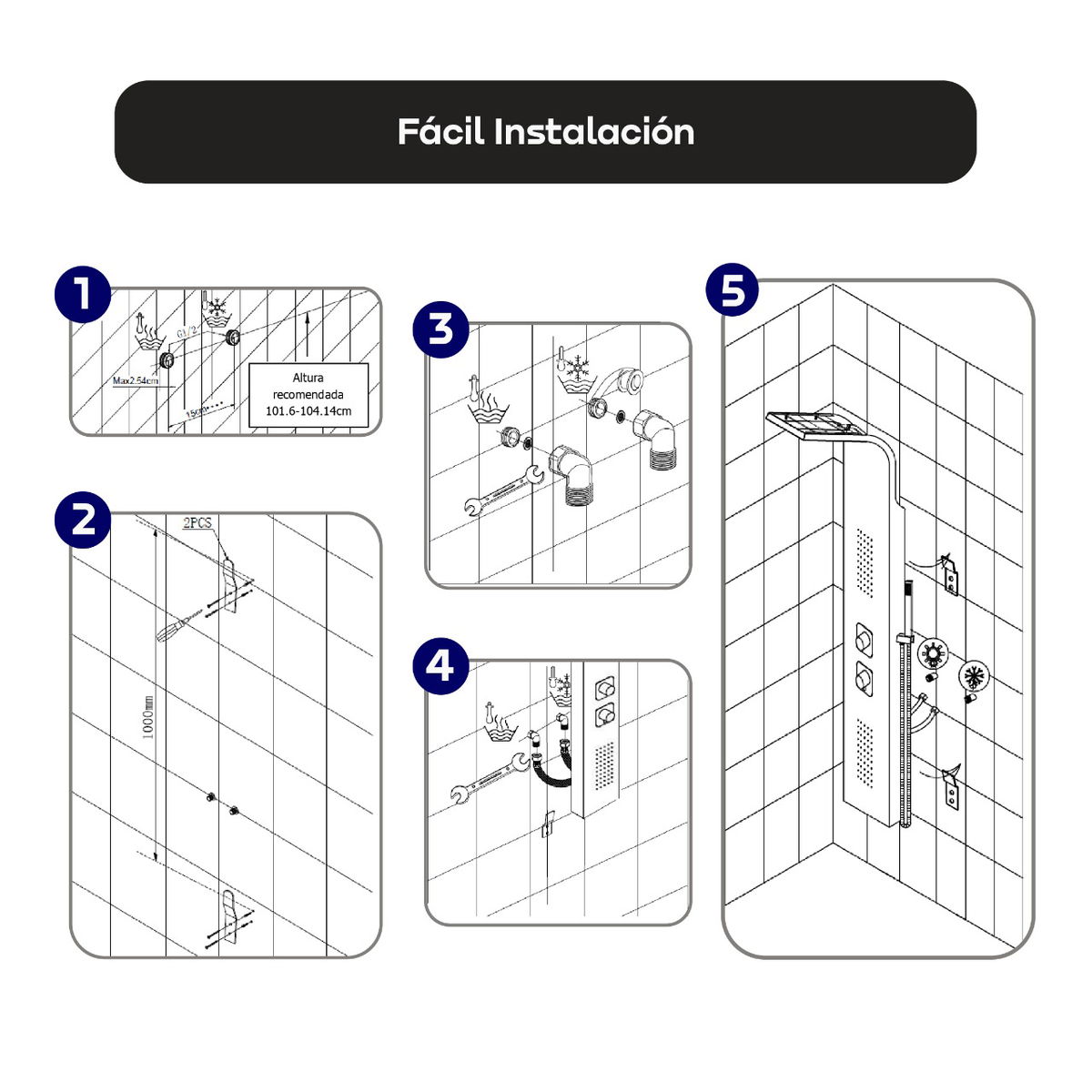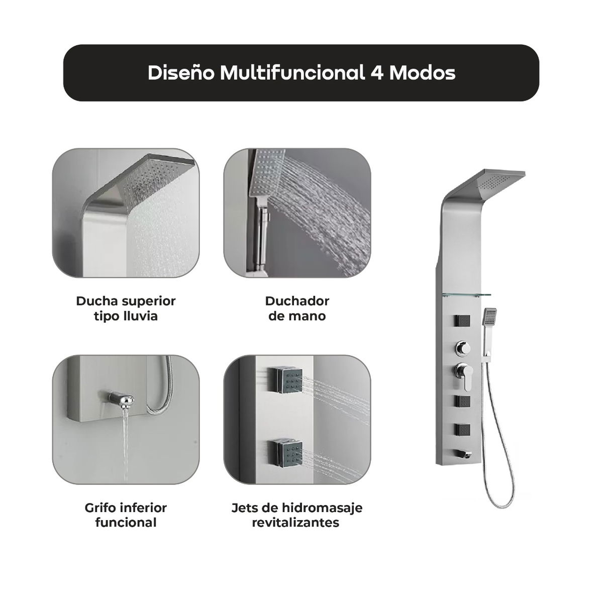 Cuatro modos de agua: Disfruta de una ducha tipo lluvia, masaje con jets, ducha de mano y caño de llenado para bañera, adaptando cada sesión a tu preferencia.