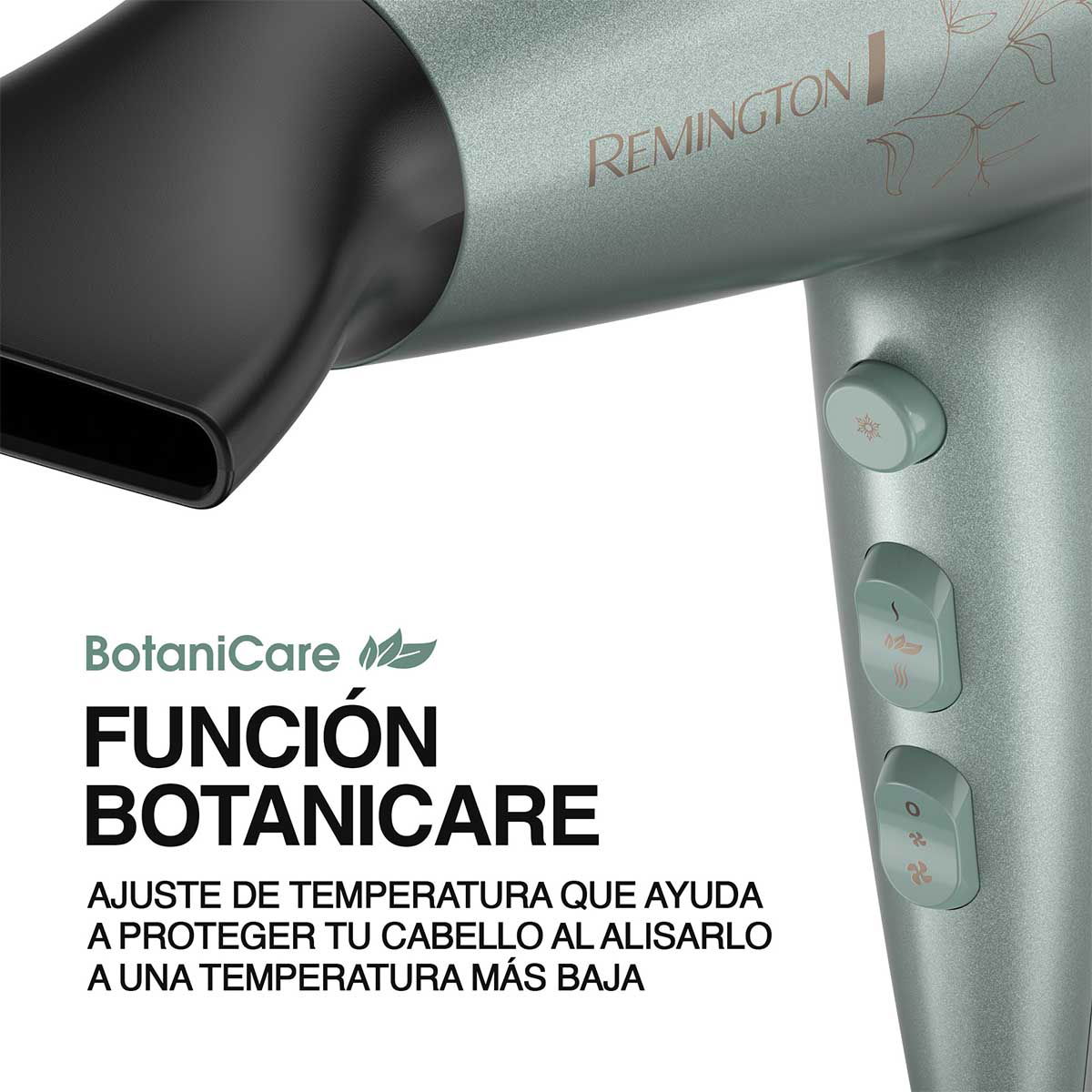 los elementos que se encuentran en la naturaleza. Su rejilla está recubierta de microacondicionador cerámico avanzado enriquecido con extracto de aloe vera, jojoba y rosa mosqueta, que se libera en el aire y cuida cada hebra mientras se seca. El secador cuenta con nuestro suave ajuste de temperatura BotaniCare, que le brinda la opción de estilizar a una temperatura más baja de 185 °C. Además, cuenta con un difusor y un concentrador que te ayudan a estilizar tu cabello a tu manera, para cualquier versión de ti mismo que quieras ser hoy. *vs. recubrimiento cerámico estándar de Remington