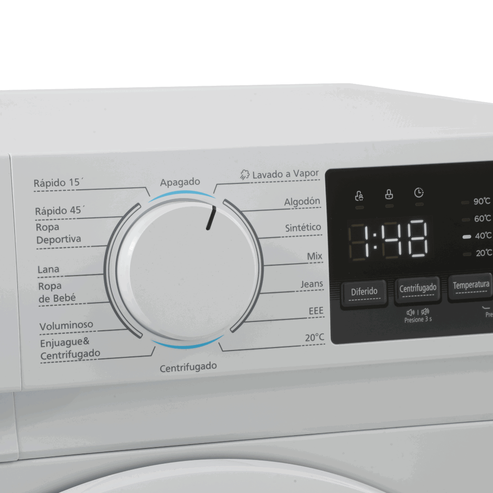 Tipo de Programas Lavado a vapor, Algodón, Sintético, Mix, Jeans, EEE, Lavado a 20°C, Rápido 45 min, Rápido 15 min, Ropa Deportiva, Lana, Ropa de Bebé, Voluminoso, Enjuague & Centrifugado, Centrifugado