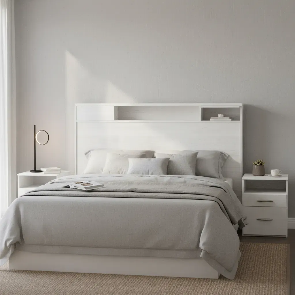 Respaldo para sommier de hasta 2 y 1/2 plazas de melamina. Estante central. Dos gavetas con puerta batiente. Color Blanco. (Disponible en otros colores).