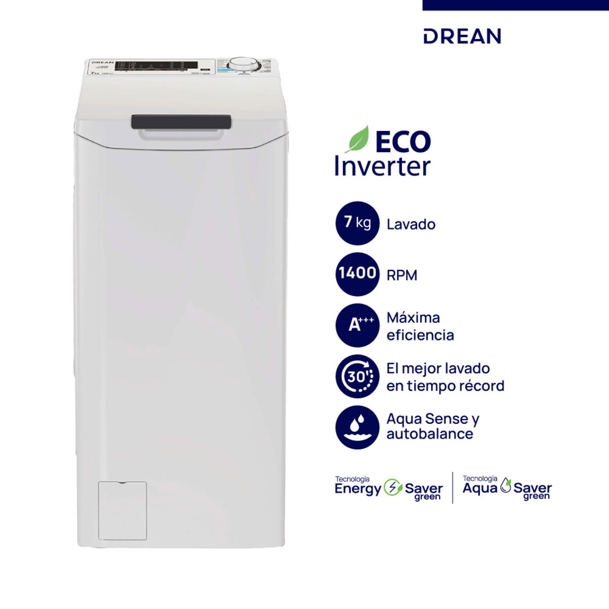 Lavarropas automático de carga superior. Tecnología Ecoinverter. Capacidad de 7 Kg. Color blanco. Velocidad de 1400 RPM. Eficiencia A+++. Sistema de lavado europeo. 15 programas. Display LED con perilla. Bloqueo para niños. Sistema autobalance. Carga autoadaptativa. Lavado rápido 14, 30 y 44’.