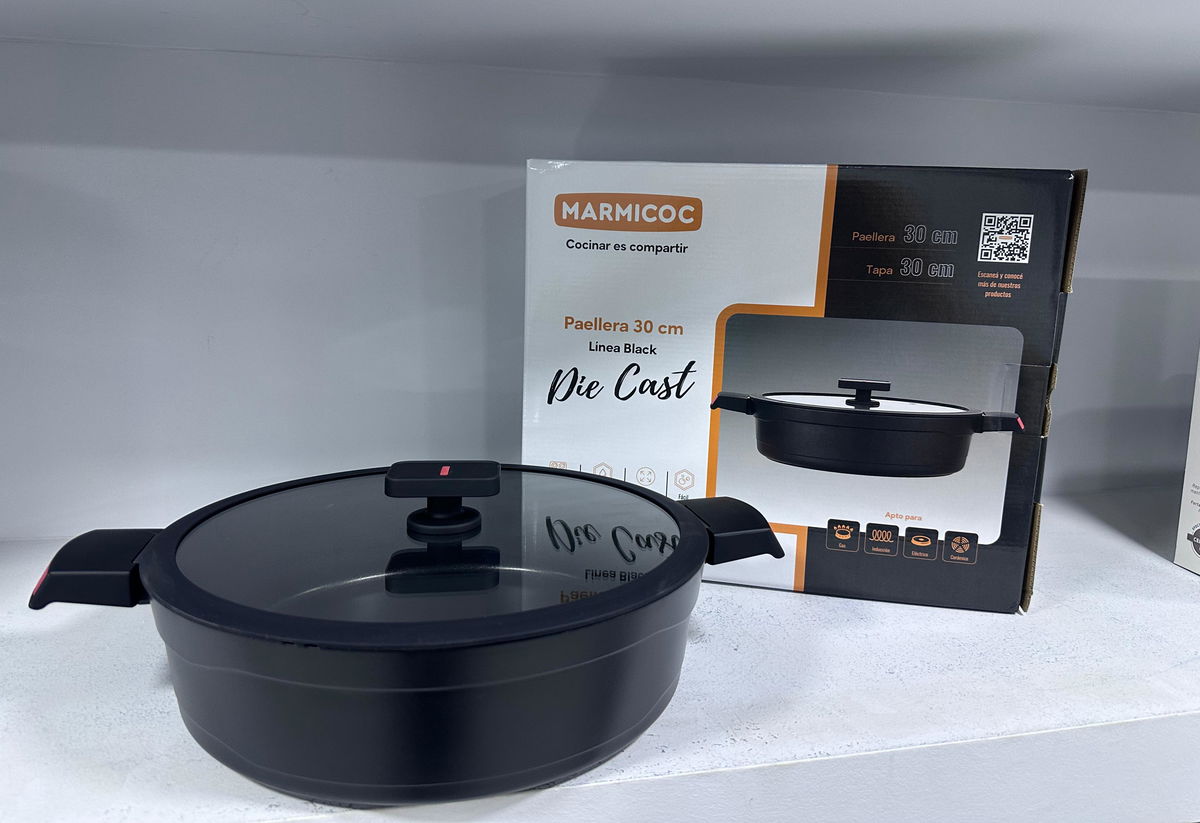 Paellera 30 de aluminio de alta densidad . Apto todo tipo de cocinas (gas, inducción, eléctricas, cerámico). Tapa de vidrio plana con aro de silicona y salida de vapor. Asa de bakelita con recubrimiento soft touch . Aleación de aluminio multicapas . Recubrimiento interior antiadherente bicapa, exterior silicona. Distribución homogénea del calor. Fácil limpieza.